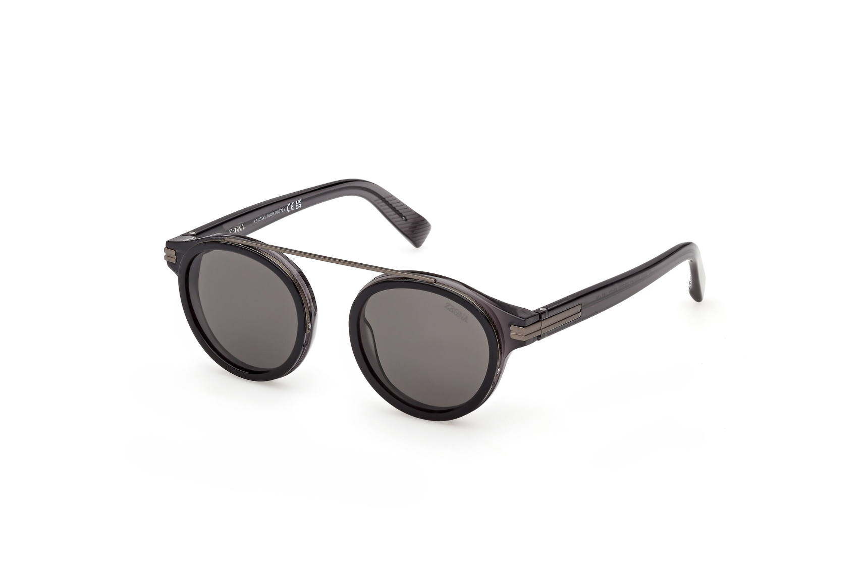 Sophisticated Italian craftsmanship meets modern eyewear design in these ZEGNA rounded sunglasses. The combination of premium metal and acetate construction delivers both durability and refined aesthetics, while the polarized smoke lenses reduce glare and protect your eyes in bright conditions. The classic round silhouette flatters most face shapes, and the black frontal paired with shiny grey temples creates an understated yet distinctive look. RX-ready for prescription lenses. A versatile essential for discerning menswear collectors.
